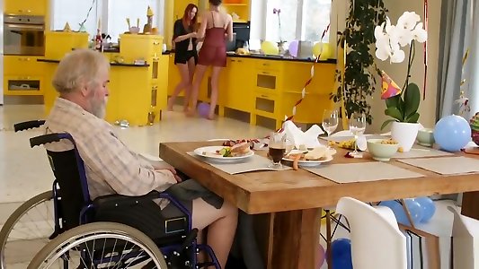 nonno handicappato si fa fare i gargarismi da adolescente con i capelli rossi nipotina