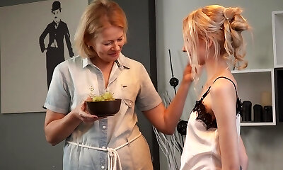 granny creams stepdaughter-in-law's legs, she accidentally massages her pussy, the daughter-in-law excitedly pulls her pantie